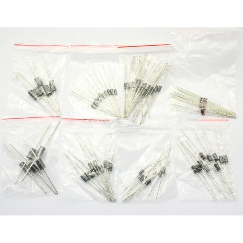 - 8 olika modeller ingår: 1N4148, 1N4007, 1N5819, 1N5399, FR107, FR207, 1N5408 och 1N5822.