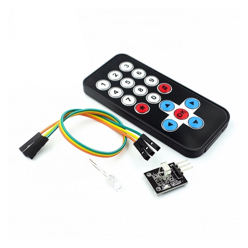 IR-mottagarmodulen kan ta emot signaler modulerade vid 38kHz och avkoda dem via Arduino-programmering, vilket gör den enkel att integrera i DIY-projekt, robotar och interaktiva lösningar. Fjärrkontrollen har en sändräckvidd på upp till 8 meter, idealisk för inomhusbruk och styrning av olika elektroniska enheter.