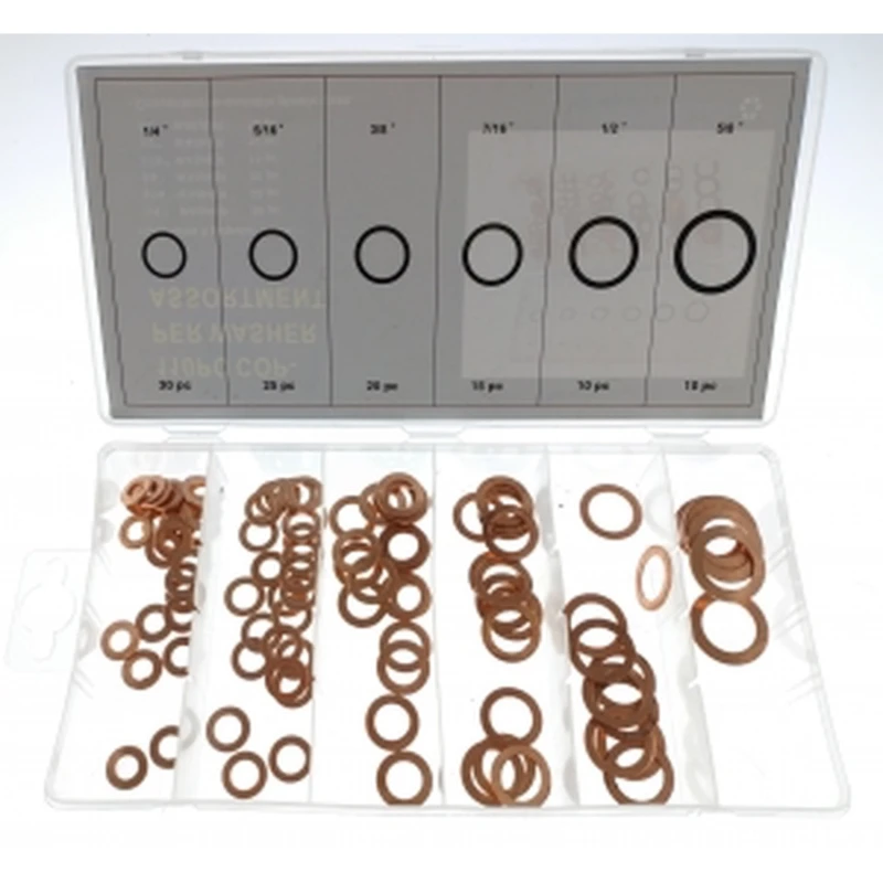 - Innehåller 110 kopparbrickor i 6 storlekar: 30 delar 6mm (1/4"), 25 delar 8mm (5/16"), 20 delar 10mm (3/8"), 15 delar 11mm (7/16"), 10 delar 12mm (1/2"), och 10 delar 16mm (5/8").