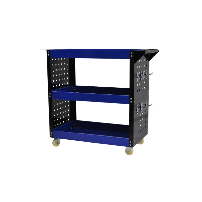 Organisera din arbetsplats med denna professionella verkstadsvagn med 3 hyllor, en förbättrad version som har perforerade metallbrickor på sidorna för att ge bättre stabilitet och mer användbar yta för verktyg. Tack vare kombinationen av blått och svart samt den robusta designen är den en praktisk och funktionell lösning för verkstäder, garage, underhållsservice och krävande hobbyanvändare.