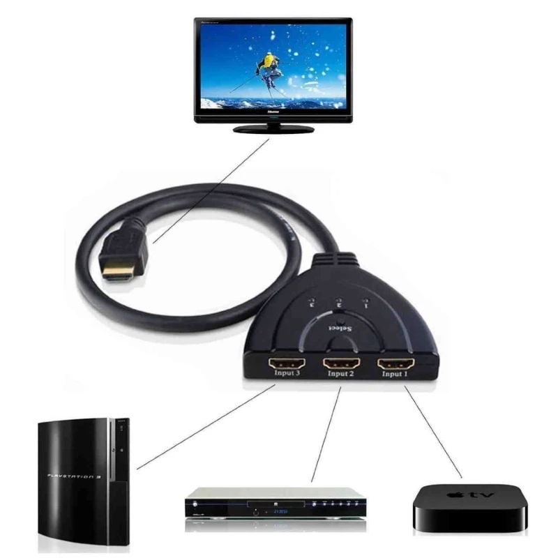 Den HDMI-växlare 3 portar är en idealisk lösning för dig som vill ansluta flera HDMI-enheter till en enda HDTV-skärm utan krångel. Denna switch HDMI 3 ingångar och 1 utgång gör det möjligt att dela videosignalen mellan upp till tre enheter, som PS3-konsoler, Xbox eller datorer, med bildkvalitet upp till 1080p och 2K.