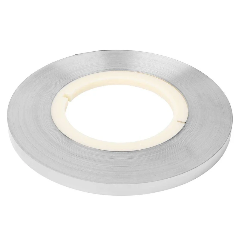 Remsan har en bredd på 8 mm och en tjocklek på 0,2 mm. Med en typisk ståldensitet (≈7,85 g/cm³) innehåller en 1 kg-rulle ungefär 79 löpmeter remsa. Dessa mått är optimala för 18650-batterier och liknande applikationer.
