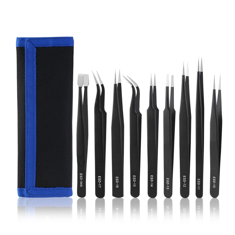 Detta set erbjuder ESD-skydd, vilket skiljer det från vanliga pincetter genom att förhindra skador från statisk elektricitet. Dessutom ger konstruktionen i rostfritt stål korrosionsbeständighet och bättre hållbarhet mot slitage, till skillnad från pincetter i kolstål eller material av lägre kvalitet som kan tappa precision och rosta snabbare.